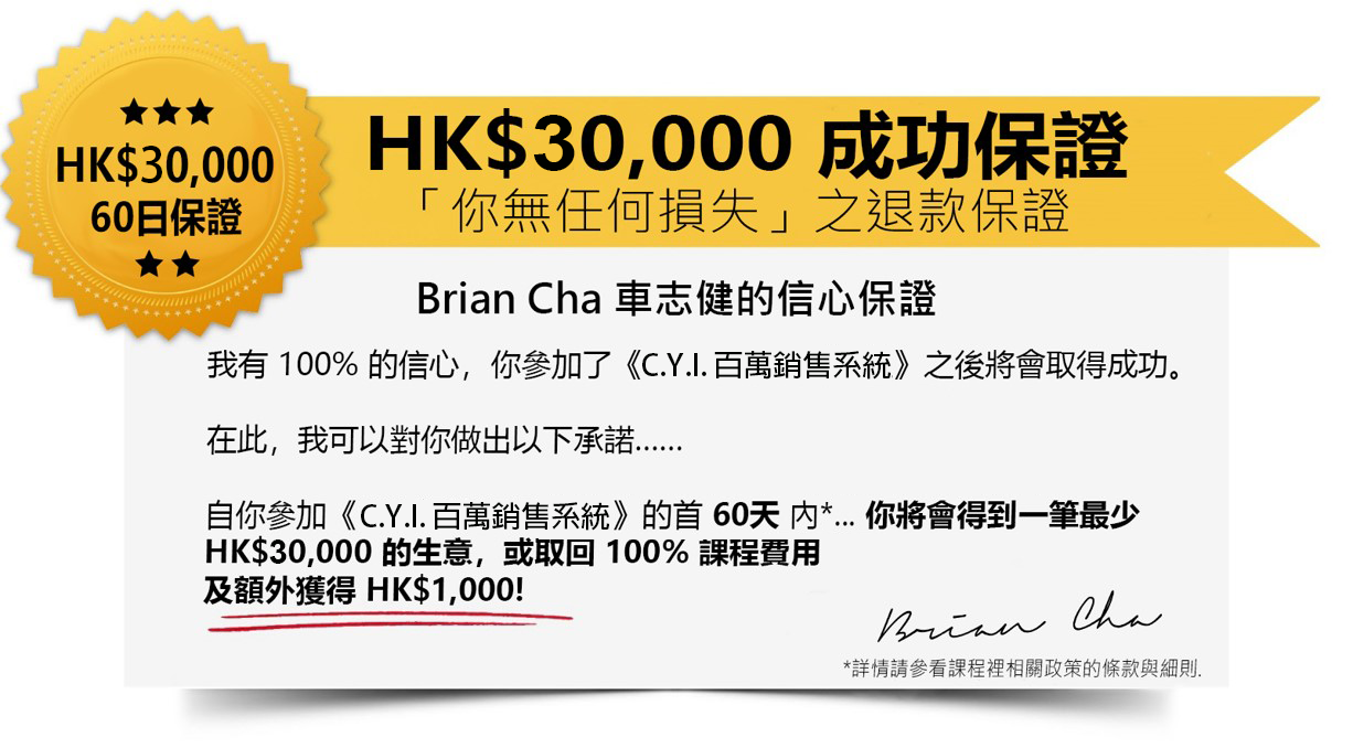當你參加並完成了《C.Y.I. 百萬行銷系統》之後,我們承諾你,憑著課堂教授的技巧及知識將能為你帶來至少 HKD $30,000(港幣)生意,若在課程開始日起之 60 天內未能達到此目標,你將有權利申請退回100%課程費用,另外會得到額外 HKD $1,000 保證金以多謝你在課堂付出的時間和努力。